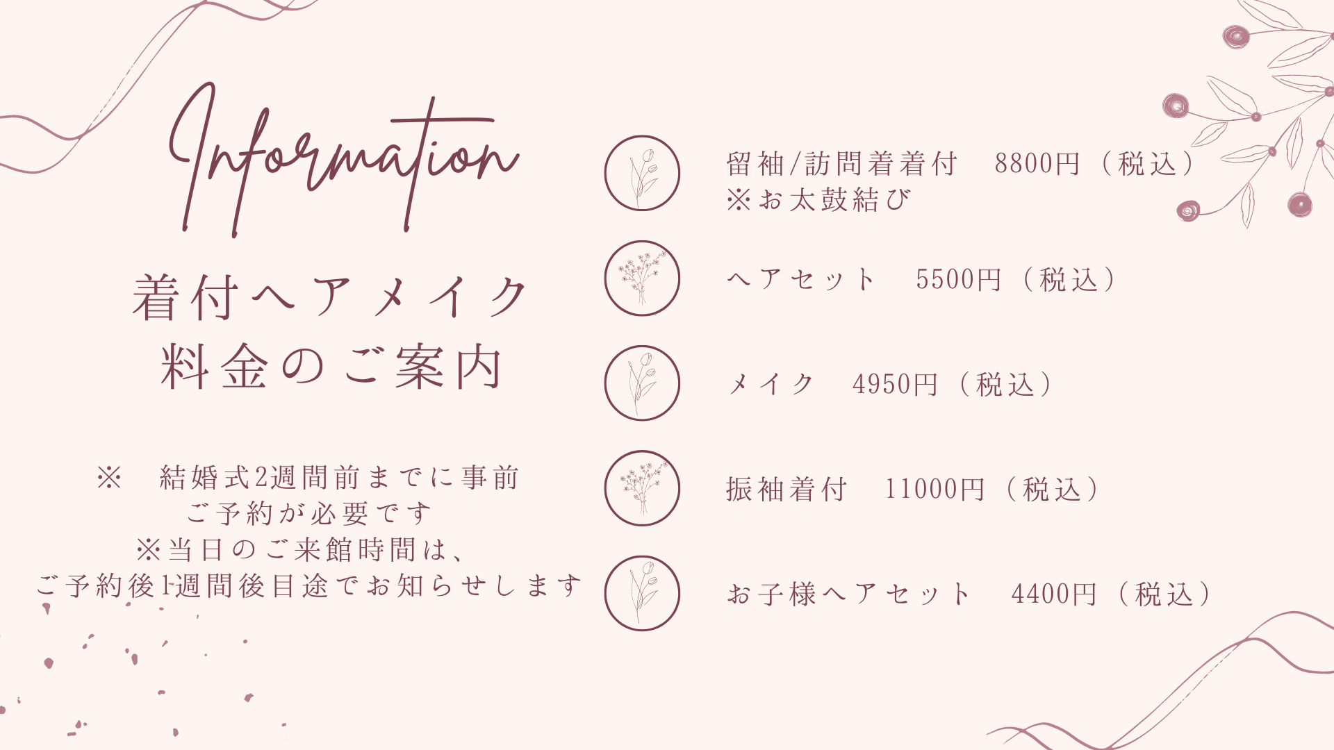 お父様用衣裳(モーニング)・黒留袖のみレンタルは承っております。ご予約の場合は、下記へご連絡お願いします。