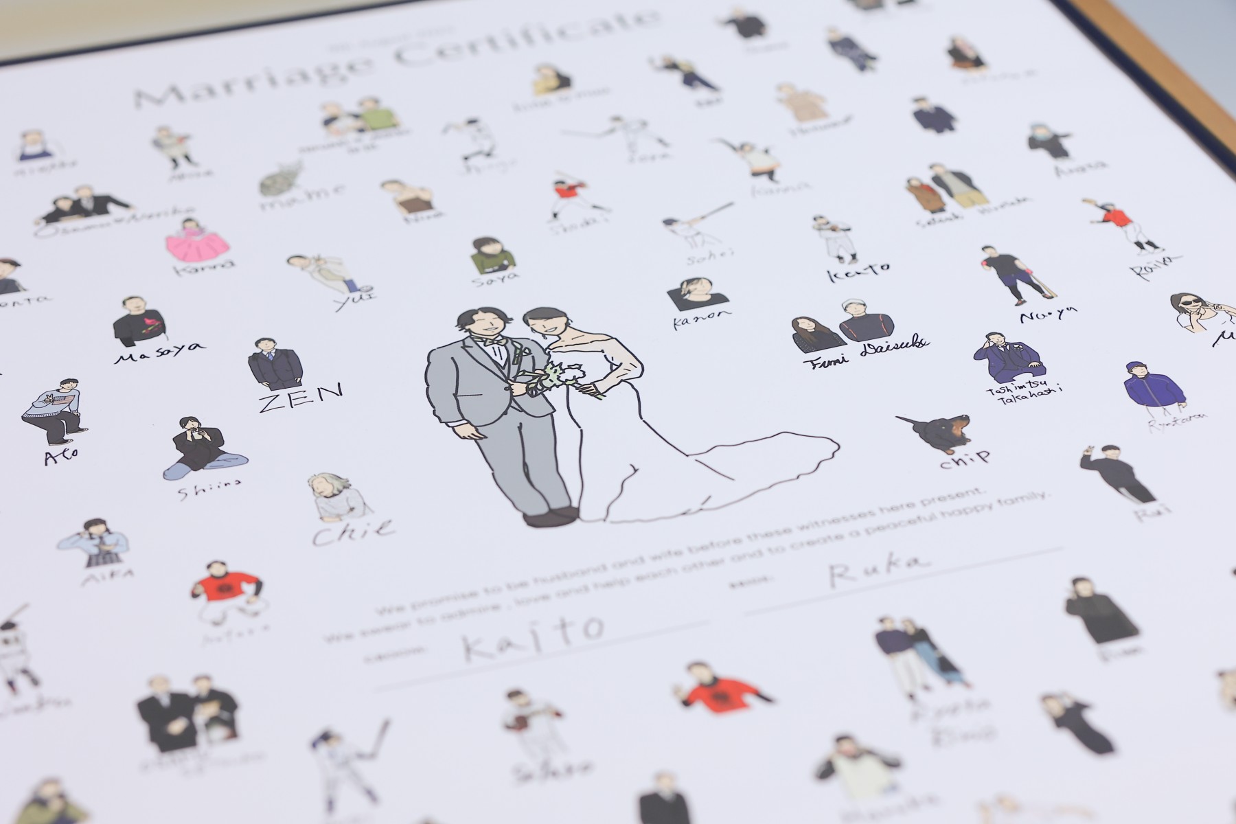 結婚を承認してもらうゲストの皆様のイラストを入れ、ゲストの特徴を捉えたイラストで自分たちなりの証明書にしました。