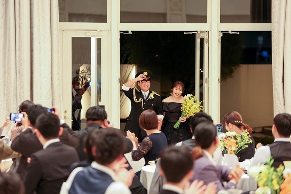 カーテンが開くとそこには制服を着た新郎様とお色直しをした新婦様が!