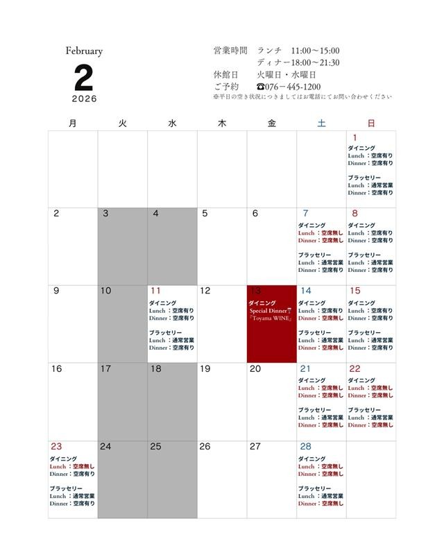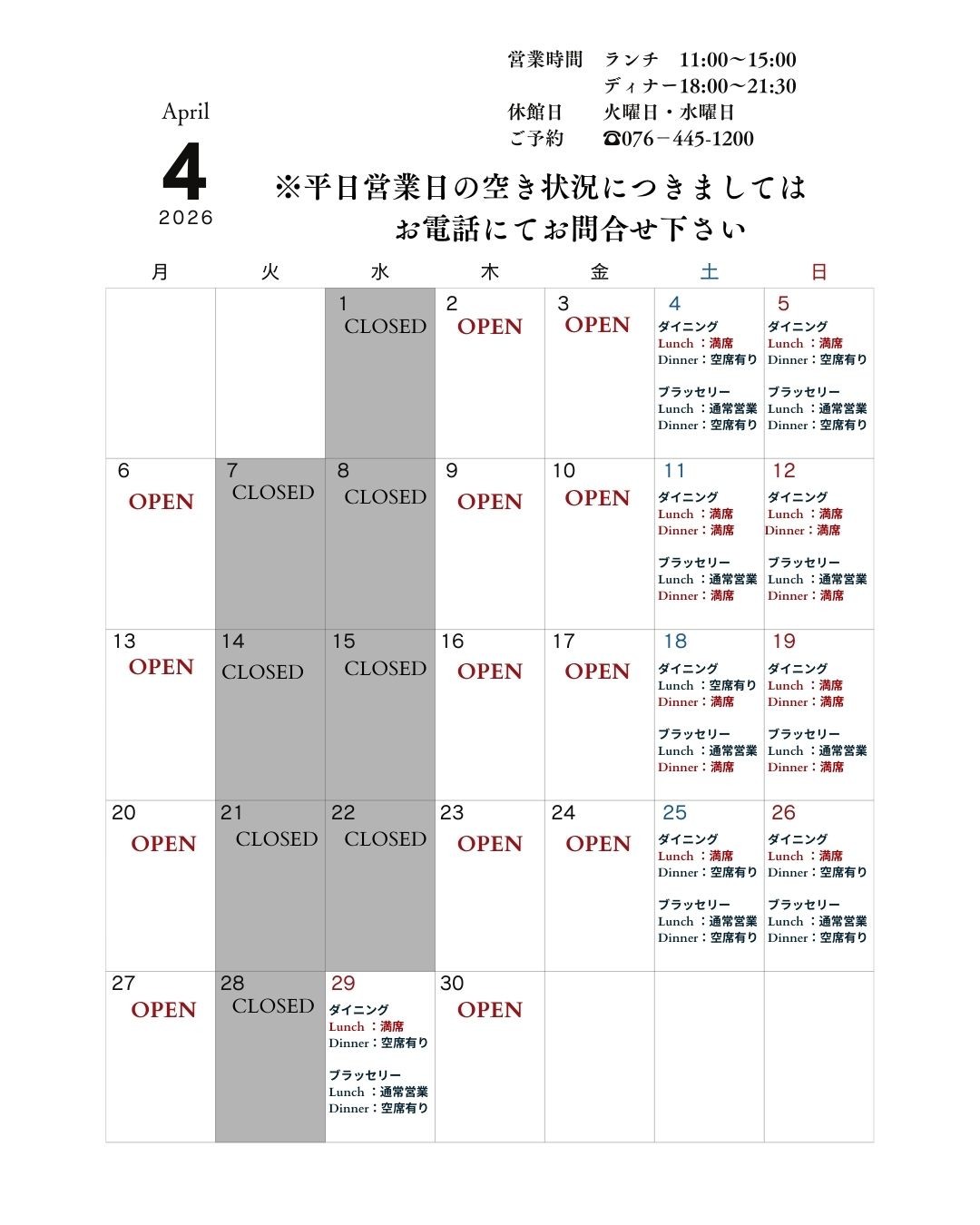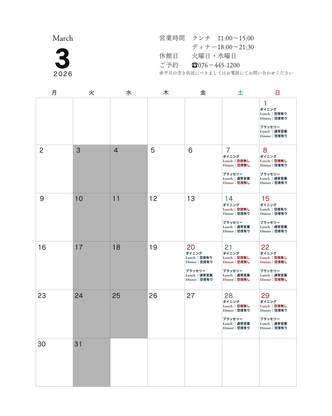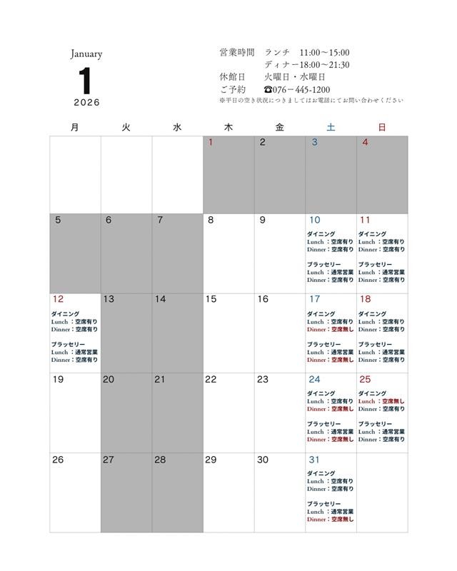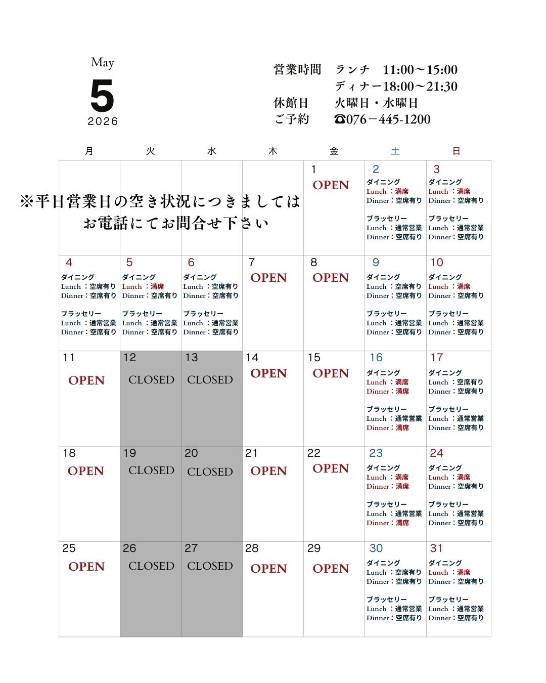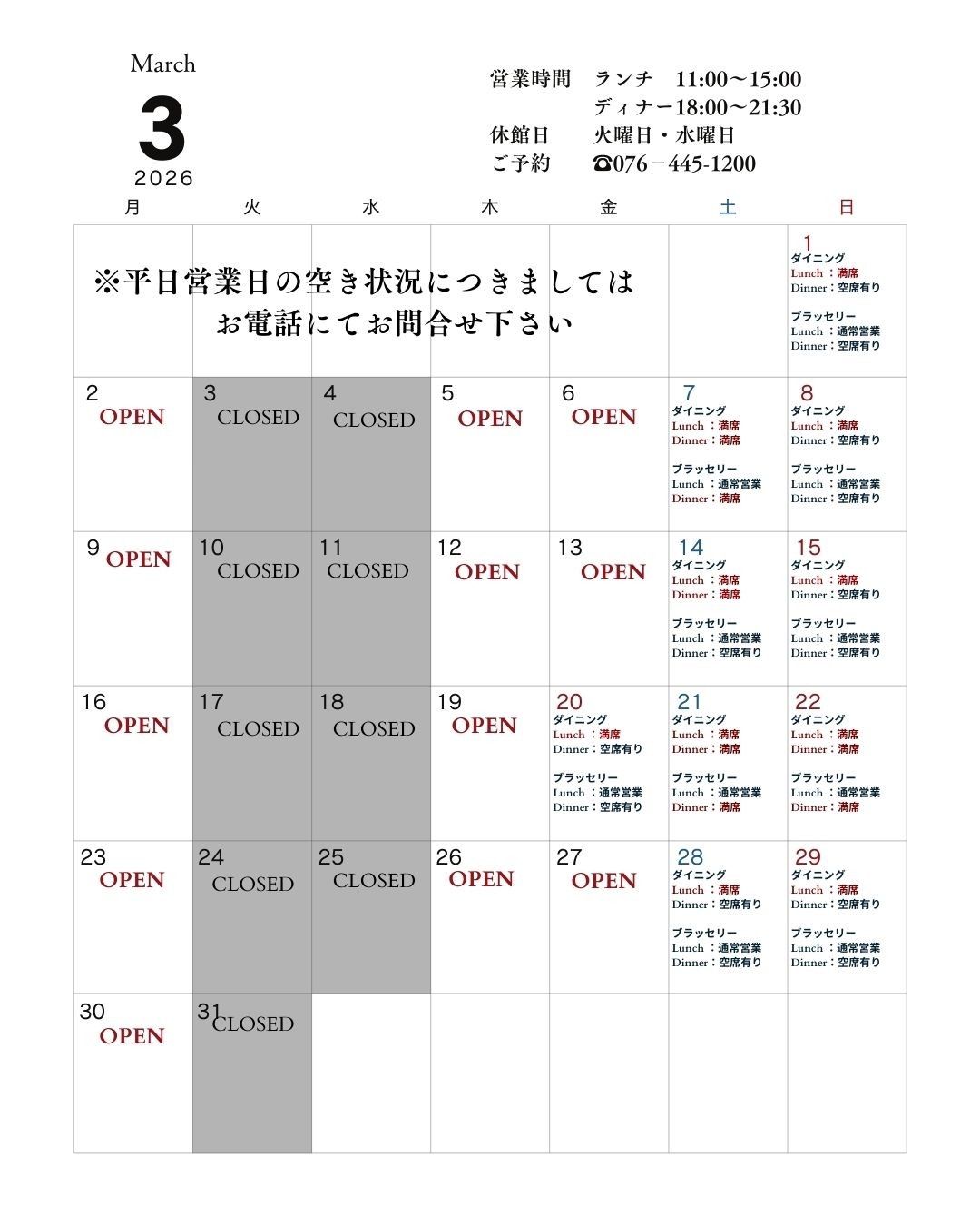 営業日・予約状況カレンダー(随時更新)