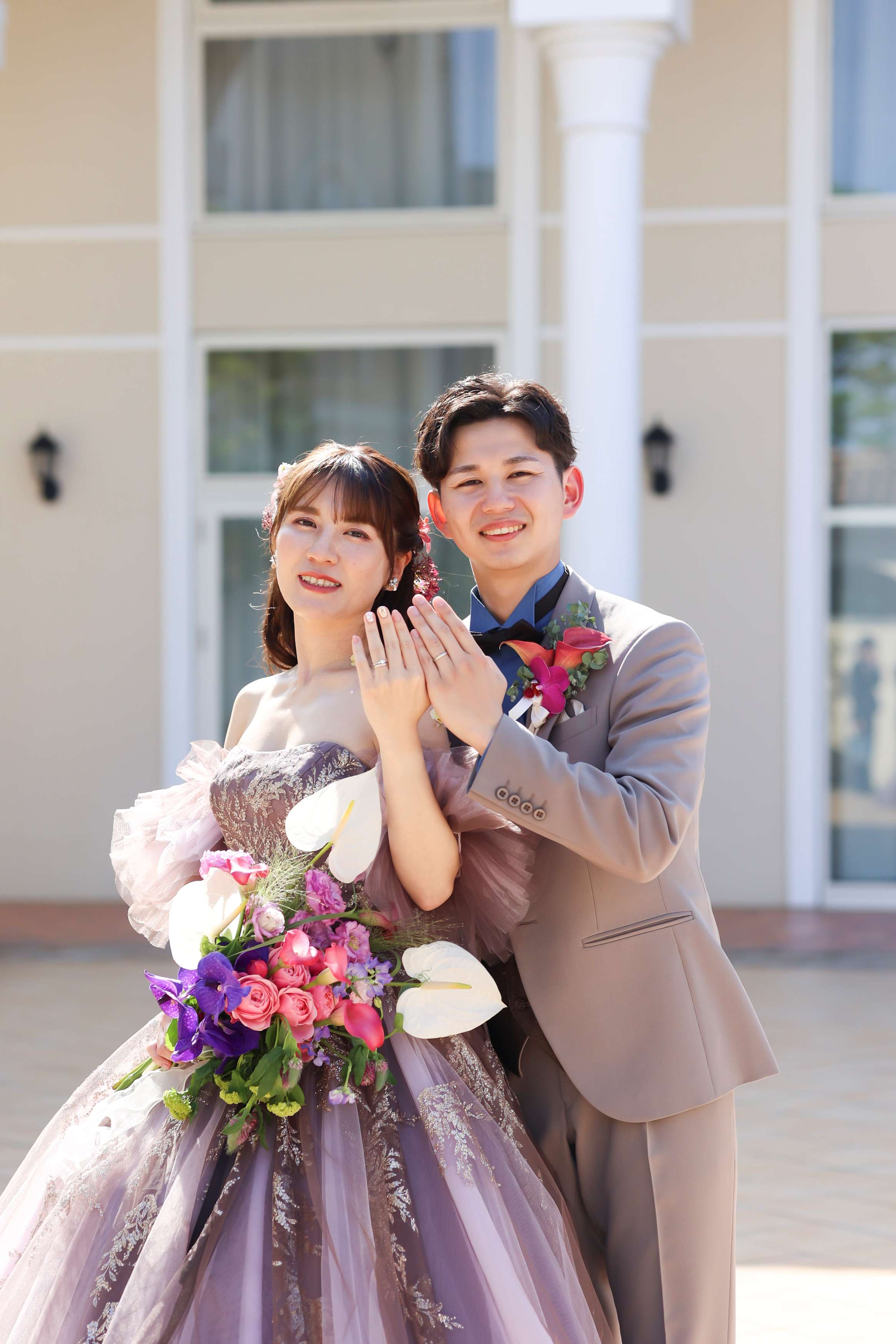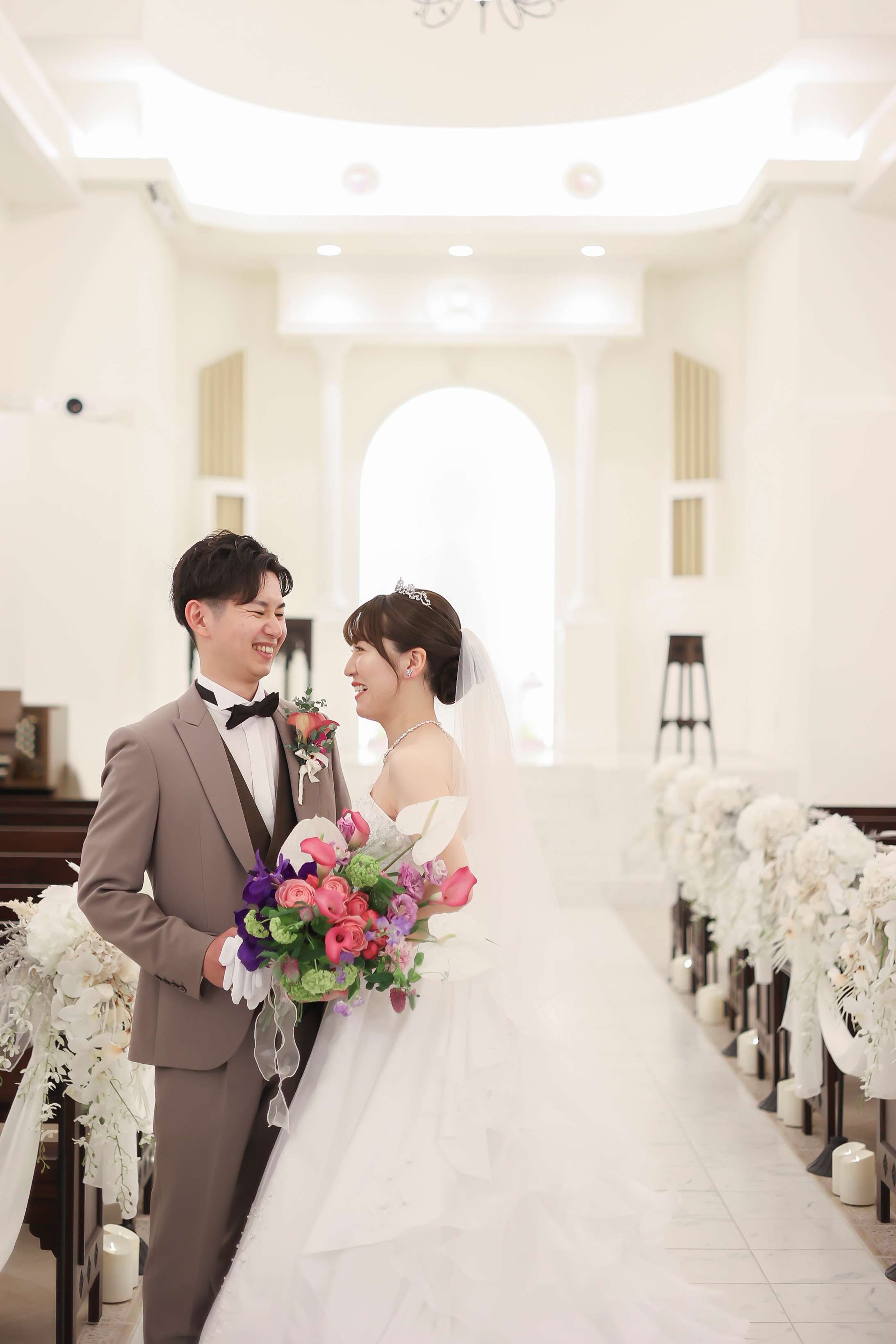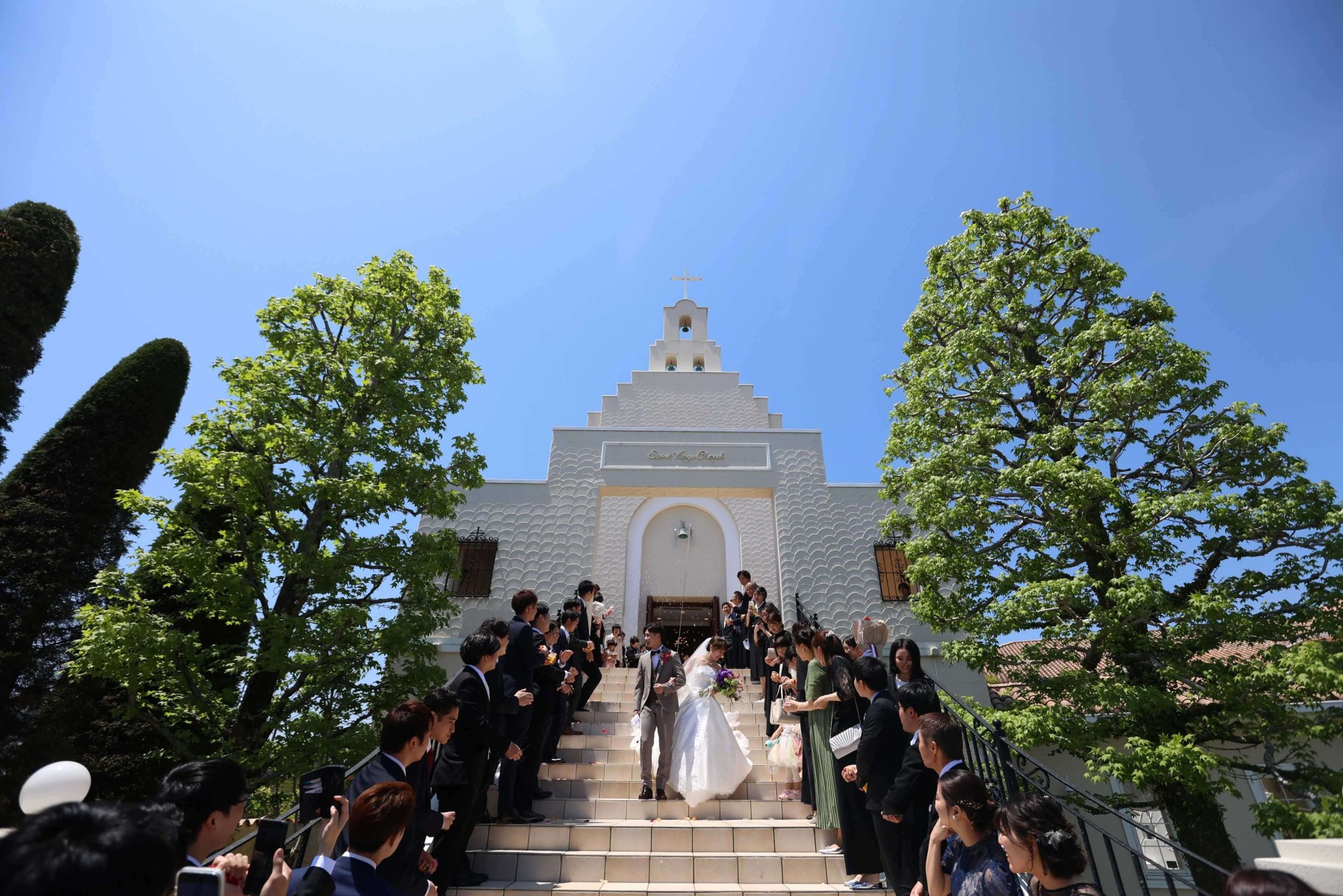 結婚式場選びで重要視したことは、本格的なチャペルがあることと、晴れたら外でフラワーシャワーがしたかったので、大階段があることでした。