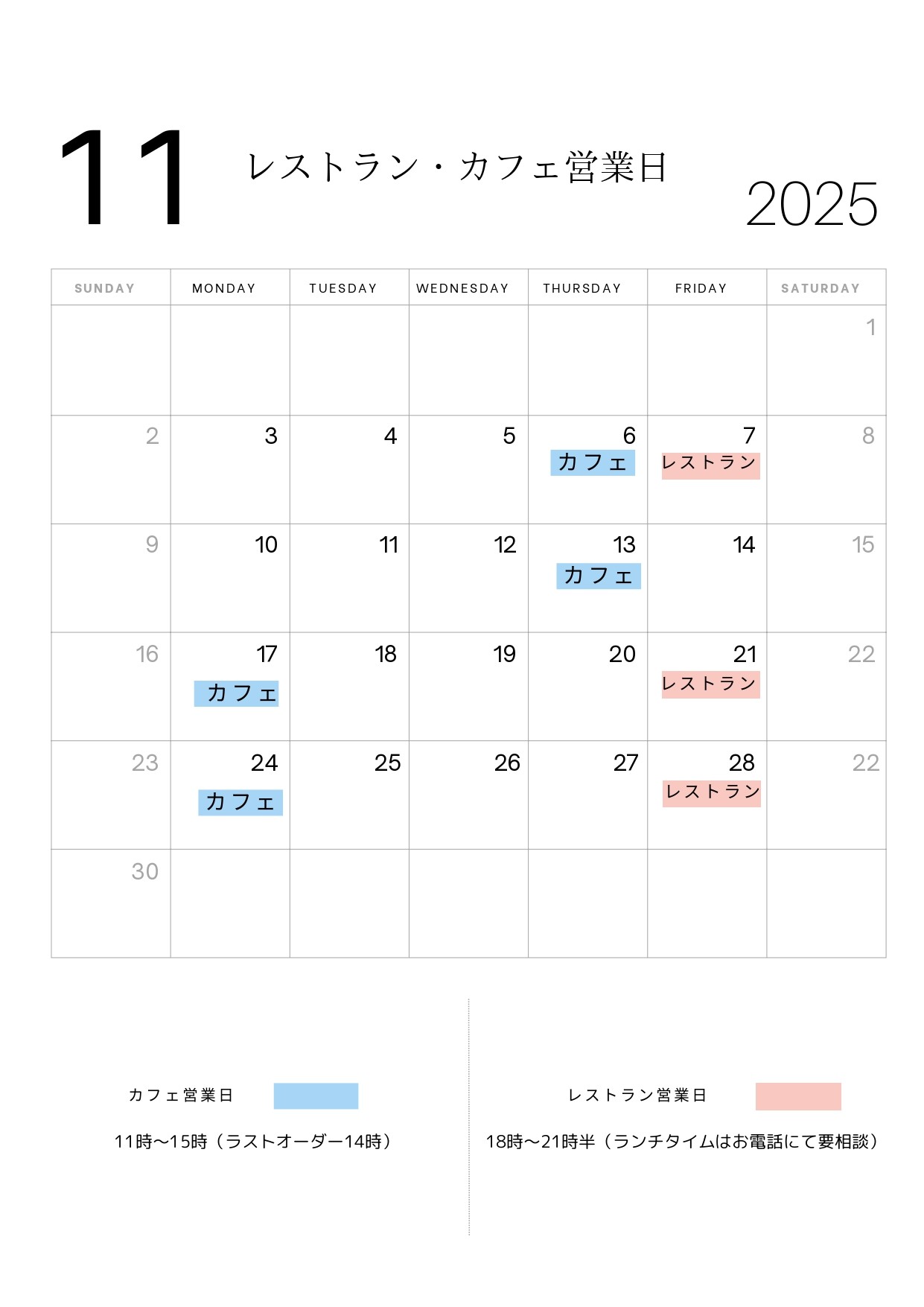 カフェ営業日は6日・13日・17日・24日 レストラン営業日は7日・21日・28日でございます。 レストラン予約は4日前までにお願いいたします。 皆様のご来館お待ちしております。