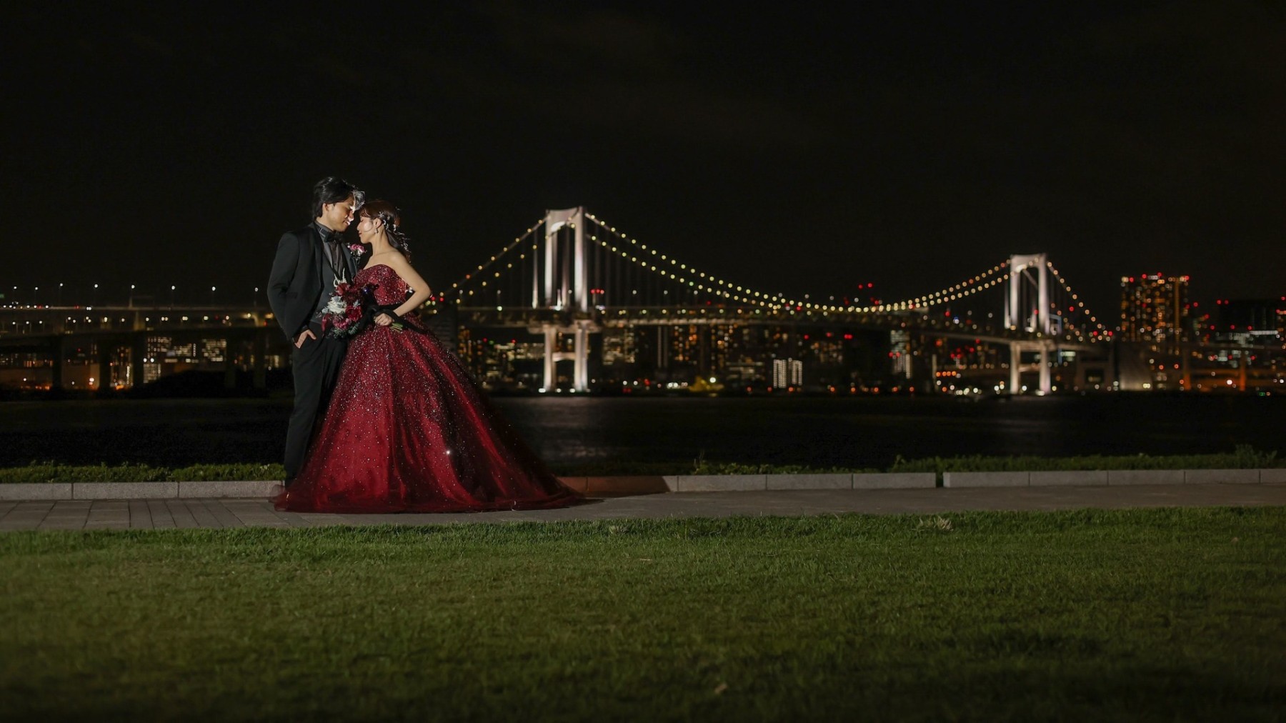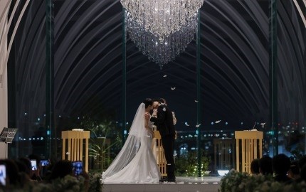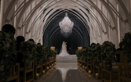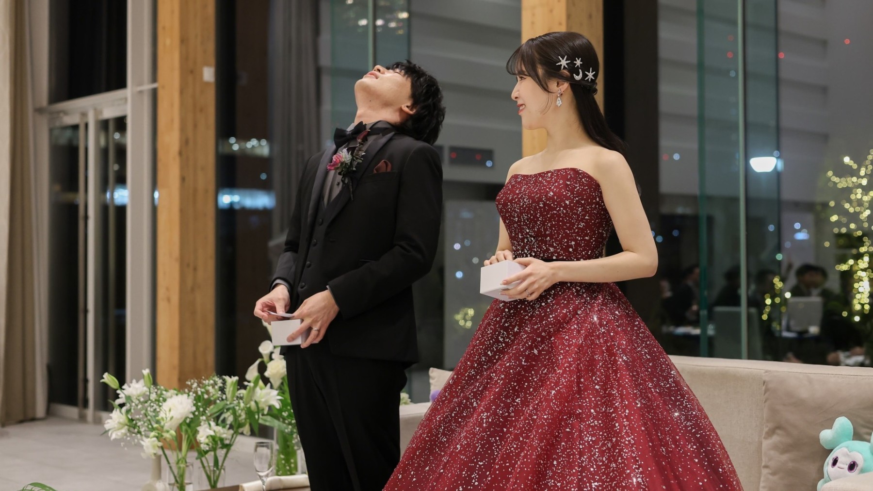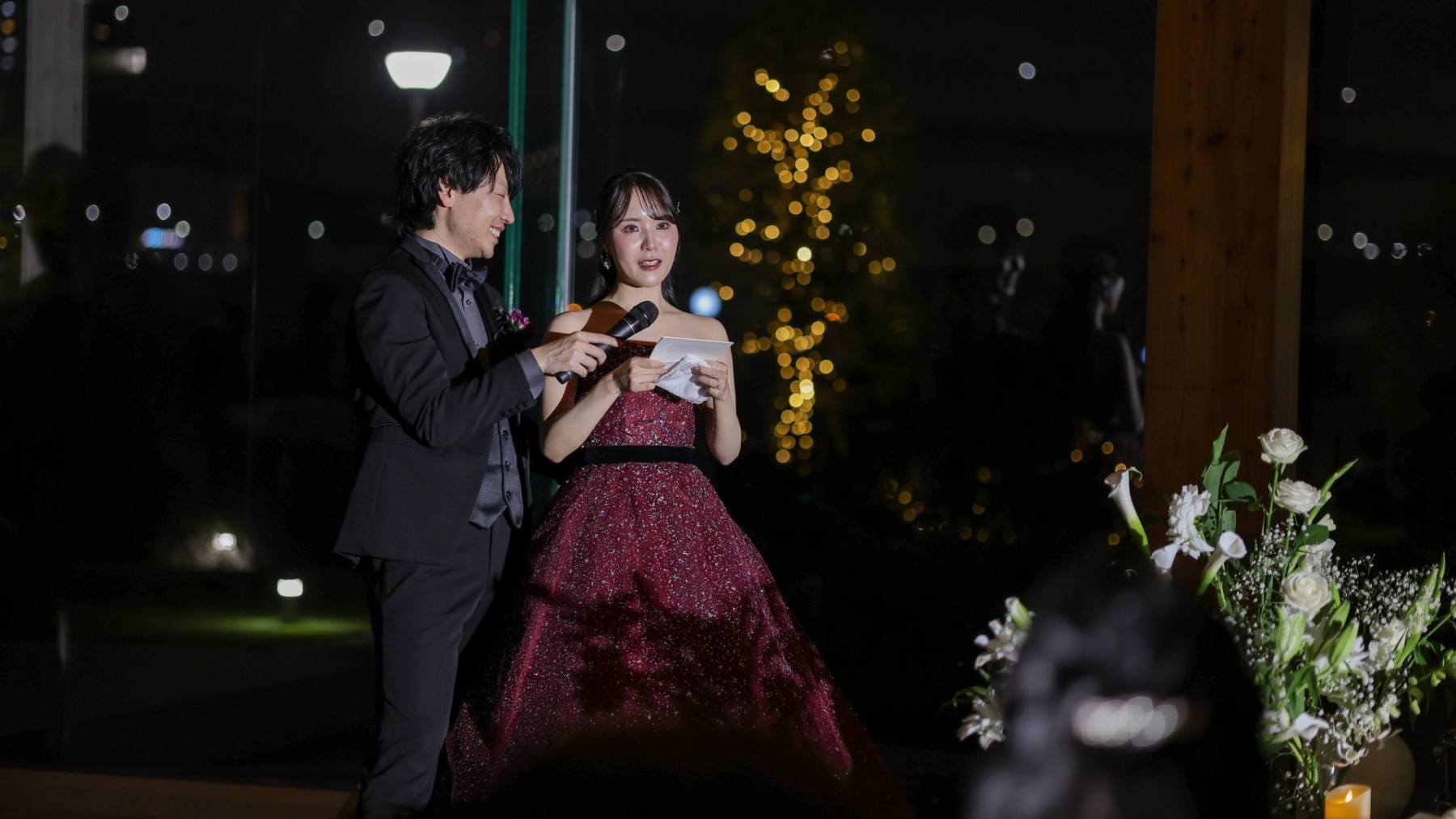 ナイトウェディングのチャペルは、シャンデリアの輝きと都内の夜景が一望でき、息をのむほどロマンチックで幻想的な空間でした。