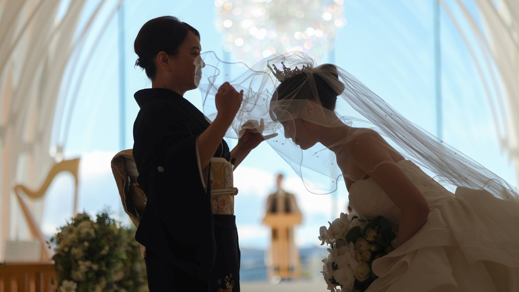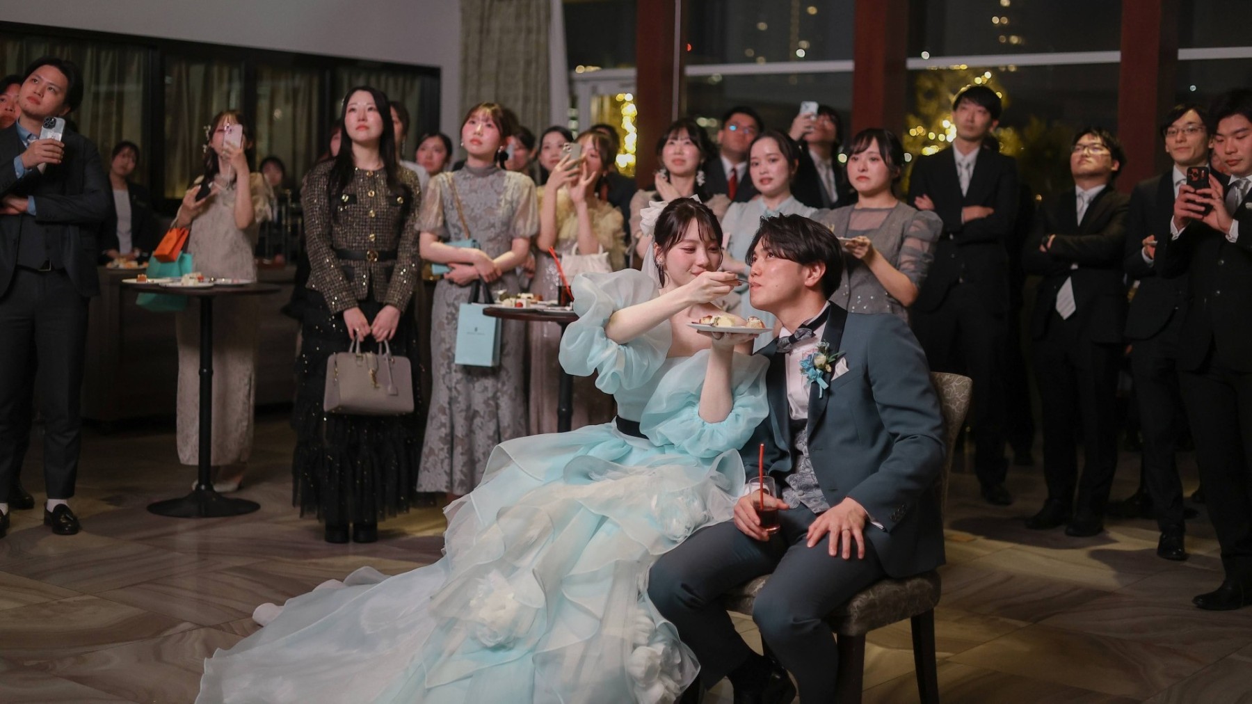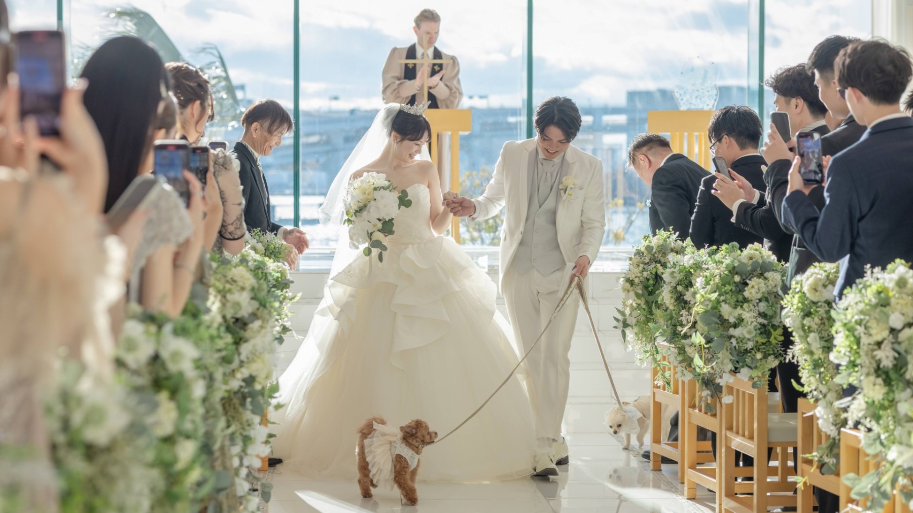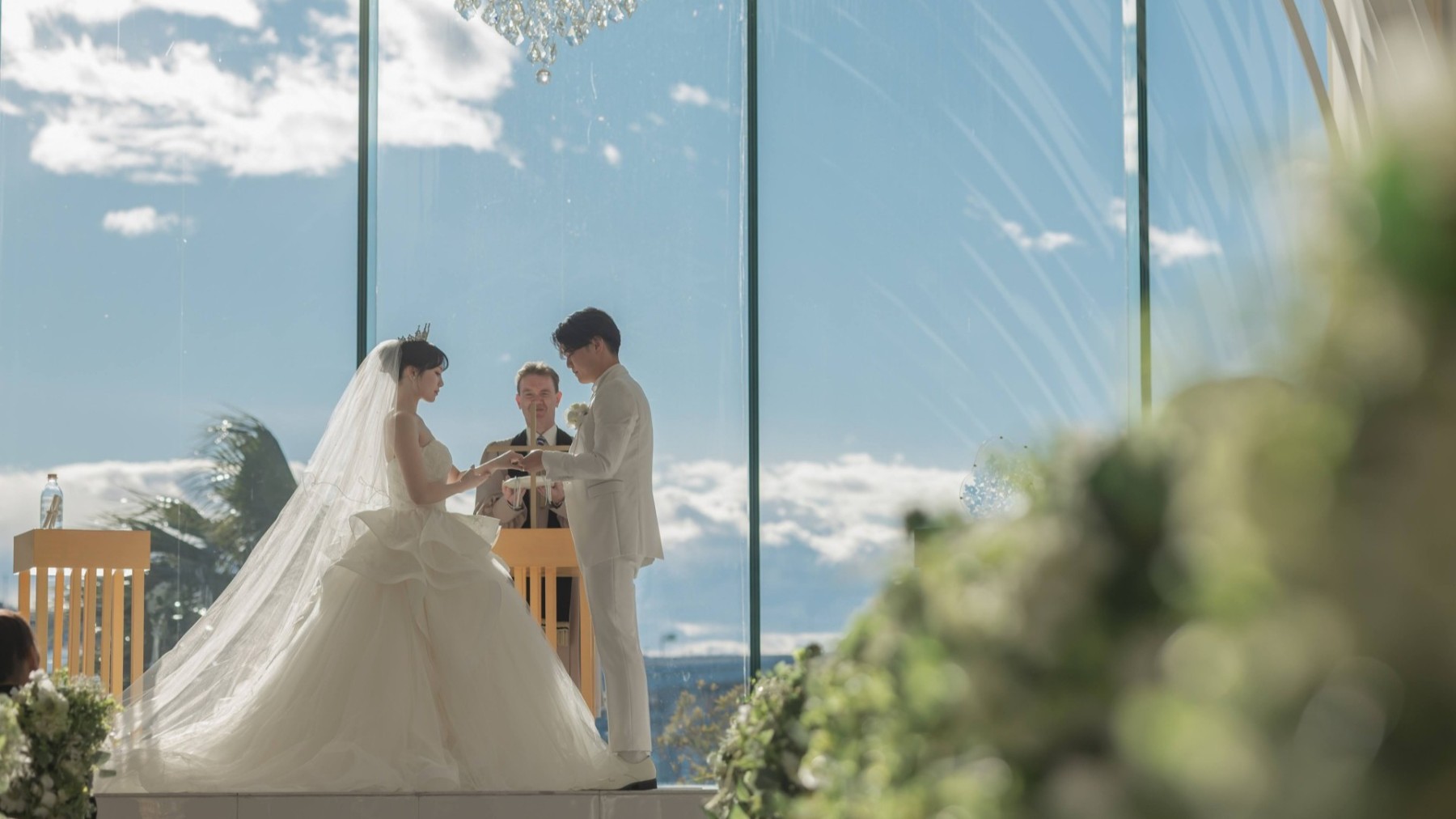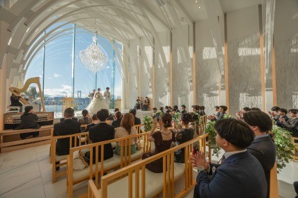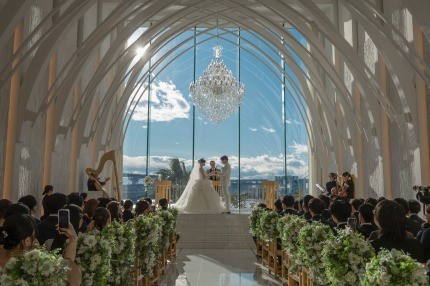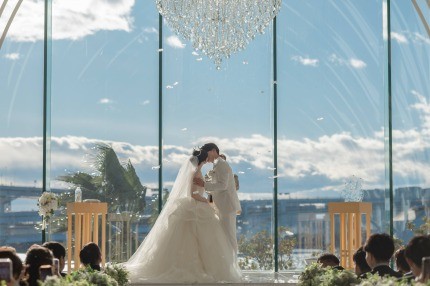 晴天だと太陽の光でシャンデリアの輝きも増すのですっごくきれいです!夜も夜景が素敵で昼夜どちらの挙式も楽しめます♪